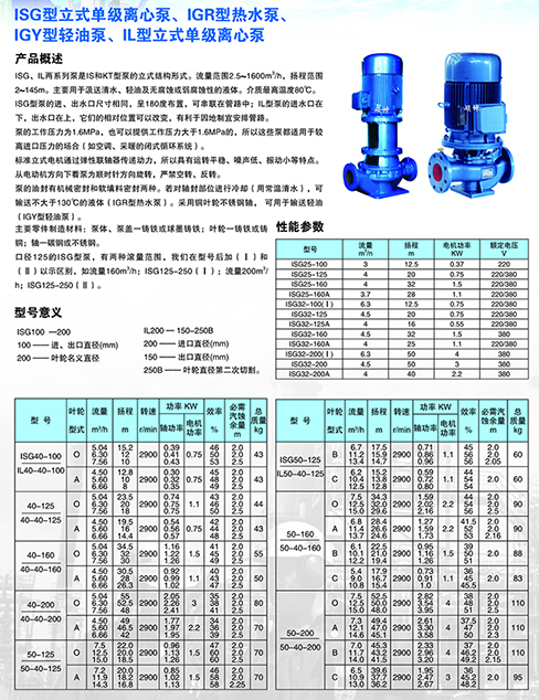 ISG型立式单级离心泵、IGR型热水泵、IGY型轻油泵、IL型立式单级离心泵